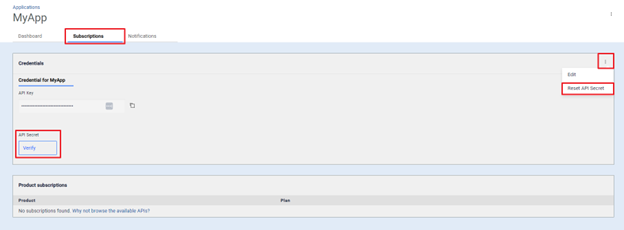 2. Then, on the main App page, go to the Subscriptions tab. Here users will be able to copy again their API Key, and right below, users can verify their API Secret. To Reset the secret, go to the navigation icon in the top right corner, and click on reset API Secret.