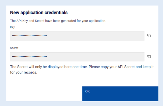4. New application credentials will be generated and given to the user. Make sure to copy and save them both, especially the API secret since it will not be shown again. Once done, click on the Ok button.